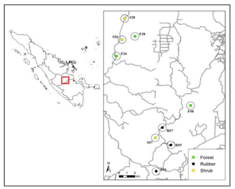 | Rubber plantation | High coverage (RH) | R05 | Bungku | -1.91117’S 103.2668’E | 2 |