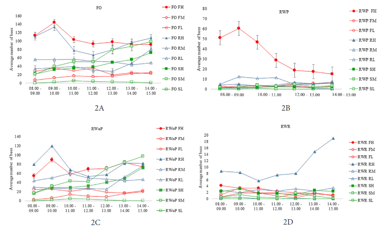In the shrub with high coverage, the flying out (FO) and returning bees without pollen bees (RWoP) were affected by temperature and humidity (Table 2c)Table 2. In the shrub with medium coverage, all the environmental factors affected these types of flight activities, while the returning bees with pollen (RWP) were only affected by temperature. All environmental factors in this habitat with low coverage only affected the flying-out bees (FO, Table 2c.)Table 2., and no bees were returned with pollen and resin (Fig. 2b, 2c)Figure 2 In this habitat, high temperatures, i.e., 31oC−43oC, might affect the low number of bee flight activities (Fig. 2a)Figure 2.