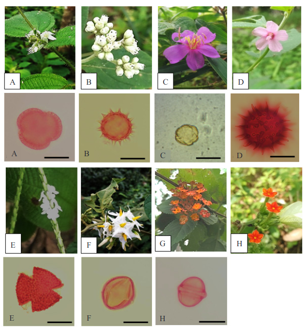 Figure 4.Flowering plants around the nest of Tetragonula laeviceps in three different habitats. √: pollen available. A: Clidemia hirta; B: Clibadium surinamensis, C: Melastoma malabathrichum; D: Urena lobata; F: Stachytarpheta indica; G: Solanum jamaicense; H: Lantana camara; and H: Mussaenda frondosa (pollen not available). Black bar = 10 μm