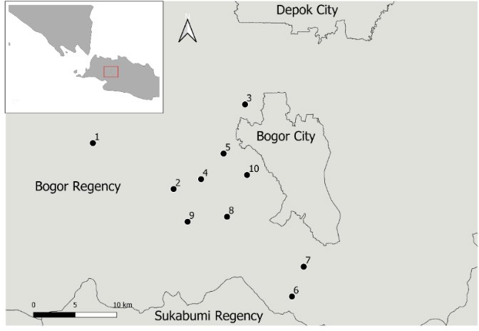 Sampling of S. frugiperda was conducted in ten invested corn fields in Bogor RegencyTable 1;Figure 1. DNA isolation, amplification, and electrophoresis were carried out at the Insect Pathology Laboratory, Department of Plant Protection, IPB University. The research was conducted from July 2020 to December 2021. Larval samples were taken from each location and put into 96% ethanol. The measured environmental parameters included elevation and the description of the location landscape within a radius of 300 m.