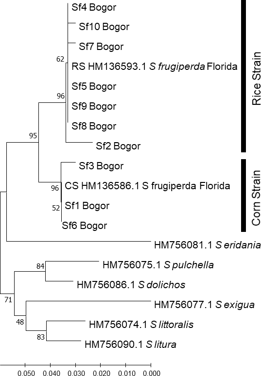 Spodoptera frugiperda is an invasive pest from the American continent that attacks corn (Zea mays) and rapidly invaded Africa and Asia. Two main factors that support migration and population distribution of this species are suitable habitats and human activities. To date, two genetic strains of S. frugiperda have been found in corn in Indonesia: the corn strain (CS) and the rice strain (RS). The most accurate gene markers to detect these strains are COI and Tpi, which are located in mitochondria and Z chromosome. This study aims to determine the existing strains of S. frugiperda and their distribution in various landscapes in Bogor Regency. The research was conducted from July 2020 to December 2021 in Bogor, West Java. Sampling of S. fungiperda was carried out from corn plants in Leuwisadeng, Pamijahan1, Pamijahan2, Kemang, Tenjolaya, Dramaga, Cigombong, Cijeruk, Tamansari, and Ciomas. Larval samples were collected and preserved using 96% ethanol, followed by DNA extraction, DNA amplification, electrophoresis, and DNA sequencing. Distribution data were analyzedusing QGIS and Google Earth Pro programs, and statistical analysis was performed using SPSS 22. Sequence data were edited using GeneStudio, aligned using ClustalW in BioEdit, and the phylogeny tree was reconstructed using the neighbor-joining method (bootstrap 1000x) using MEGA X. The obtained sequences were compared with sequences from the GenBank® database. The results showed the presence of two distinct strains of COI (COI-CSh4 and COI-RS) and one strain of Tpi (Tpi-C) in Bogor. The study found no relationship between thelandscape structure and genetic variation of S. frugiperda.