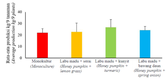 Sejalan dengan pengaruh perlakuan tumpang sari labu madu dengan serai, kunyit, dan bawang daun, pada produksi labu madu berdasarkan analisis ragam juga tidak berpengaruh. Walaupun demikian, dari segi selisih produksi, produksi labu madu pada perlakuan tumpang sari labu madu dan kunyit menunjukkan hasil 21% lebih banyak dibandingkan dengan monokultur .