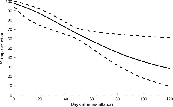 Figure 1.Percentage trap reduction in PFP compared to CGP over a wet season, 2020–2021. The solid line represents median trap reduction, and the dotted lines represent 95% credible intervals.
