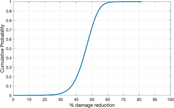 Figure 3.Cumulative distribution function (CDF) of % damage reduction due to yellow stemborer in PFP plot compared to CGP. The wet season, 2020–2021. The median damage reduction at the 0.5 mark on the y-axis gives value ~40% damage reduction.