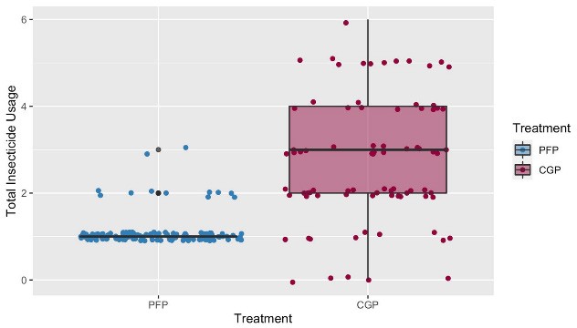 Insecticide usage reduction with mating disruption. The collected data of several insecticide spray applications in PFP and CGP plots were analyzed by comparing the median number with paired t-test in MATLAB (Inc, 2021).