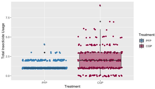 Figure 8.The number of insecticide applications made to manage yellow stem borers of rice in PFP and CGP plots. Each dot represents a spray application. The wet season 2020–2021.