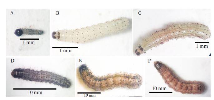 Gambar 1.Perkembangan larva Spodoptera frugiperda. A: instar 1; B: instar 2; C: instar 3; D: instar 4; E: instar 5; F: instar 6.(Larval development of Spodoptera frugiperda. A: 1st instar; B: 2nd instar; C: 3rd instar; D: 4th instar; E: 5th instar; F: 6th instar)