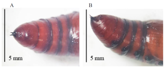 Gambar 3.Pupa Spodoptera frugiperda. A: pupa jantan; B: pupa betina.(Pupae of Spodoptera frugiperda: A: male pupae; B: female pupae.)