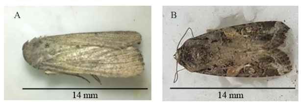 Gambar 4.Imago Spodoptera frugiperda. A: imago betina; B: imago jantan.(Adult of Spodoptera frugiperda. A: female; B: male.)