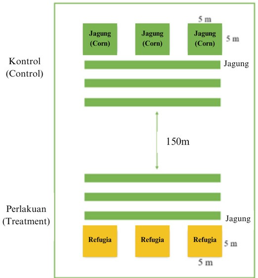 Penelitian lapangan dilaksanakan pada dua musim berbeda, yaitu musim kemarau/musim 1 (bulan April hingga Juli 2022) dan musim hujan/ musim 2 (bulan September hingga Desember 2022) di Desa Tumpang, Kabupaten Malang. di Desa Tumpang, Kecamatan Tumpang, Kabupaten Malang, Provinsi Jawa Timur (8°00’06.7”LS 112°45’17.5”BT). Pengambilan sampel dilakukan di empat lahan jagung dengan setiap area terdapat lahan perlakuan dan lahan kontrol Gambar 1 Penelitian dilaksankan dengan menerapkan dua kali musim tanam dan setiap petak maupun area berjarak minimal 150 meter. Area 1 berada di dekat lahan pemukiman warga, area 2 terdapat banyak tanaman tahunan di sekitarnya, area 3 berada pemukiman warga, tetapi masih terdapat banyak tanaman tahunan di sekitarnya, dan untuk area 4 berada pada lahan yang di sekitarnya terdapat tanaman jagung monokultur dan sayuran. Pengamatan kelimpahan spesies laba-laba predator dan parasitoid Hymenoptera dilakukan ketika tanaman jagung memasuki berumur 4, 6, 8, 10, dan 12 minggu setelah tanam (MST). Hasil dari pengambilan sampel di lahan kemudian diidentifikasi dan dianalisis. Identifikasi sampel dilakukan di Laboratorium Hama, Departemen Hama dan Penyakit Tumbuhan, Fakultas Pertanian Universitas Brawijaya dan Laboratorium Pengen- dalian Hayati, Departemen Proteksi Tanaman, Fakultas Pertanian, Institut Pertanian Bogor.Tanaman refugia yang digunakan adalah kenikir/marigold (Tagetes spp.), bunga pukul delapan (Turnera subulata), bunga matahari (Helianthus annuus), kacang panjang (Vigna unguiculata), kacang hias (Arachis pintoi), dan air mata pengantin (Antigonon leptopus). Budi daya tanaman jagung yang dilakukan dalam penelitian ini menggunakan protokol yang berlaku di PT. Syngenta. Budi daya jagung dilakukan dengan menggunakan benih jagung varietas NK6172 Perkasa, insektisida digunakan untuk mengendalikan hama. Selain itu, terdapat pupuk urea, NPK, dan pupuk kandang kotoran kambing digunakan untuk menambahkan unsur hara pada tanah.Lahan penelitian tanaman jagung dibagi menjadi dua, yaitu petak perlakuan dan petak kontrol dengan luas lahan jagung 2.000 m2. Petak perlakuan adalah petak yang ditanami tanaman refugia. Lahan perlakuan terdiri atas tiga petak dengan setiap petak berukuran 5 m × 5 m Gambar 2 Petak kontrol terdiri atas 1 petak dengan hanya ditanami jagung tanpa refugia. Jarak antar petak perlakuan dengan petak kontrol kurang lebih 150 m. Petak perlakuan dibuat sebagai wilayah rekayasa ekologi dengan menanam enam jenis tanaman refugia yang berbeda.