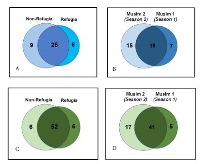 Gambar 4.Diagram venn perbedaan komposisi musuh alami antara lahan jagung dengan perlakuan refugia dan tanpa perlakuan refugia (A: untuk laba-laba predator dan C: untuk parasitoid Hymenoptera) dan musim tanam tanam berbeda (B: untuk laba-laba predator dan D: untuk parasitoid Hymenoptera).(Venn diagram of differences in natural enemy composition between corn fields with refugia treatment and without refugia treatment (A: for predatory spiders and C: for Hymenoptera parasitoids) and different planting seasons (B: for predatory spiders and D: for Hymenoptera parasitoids).)