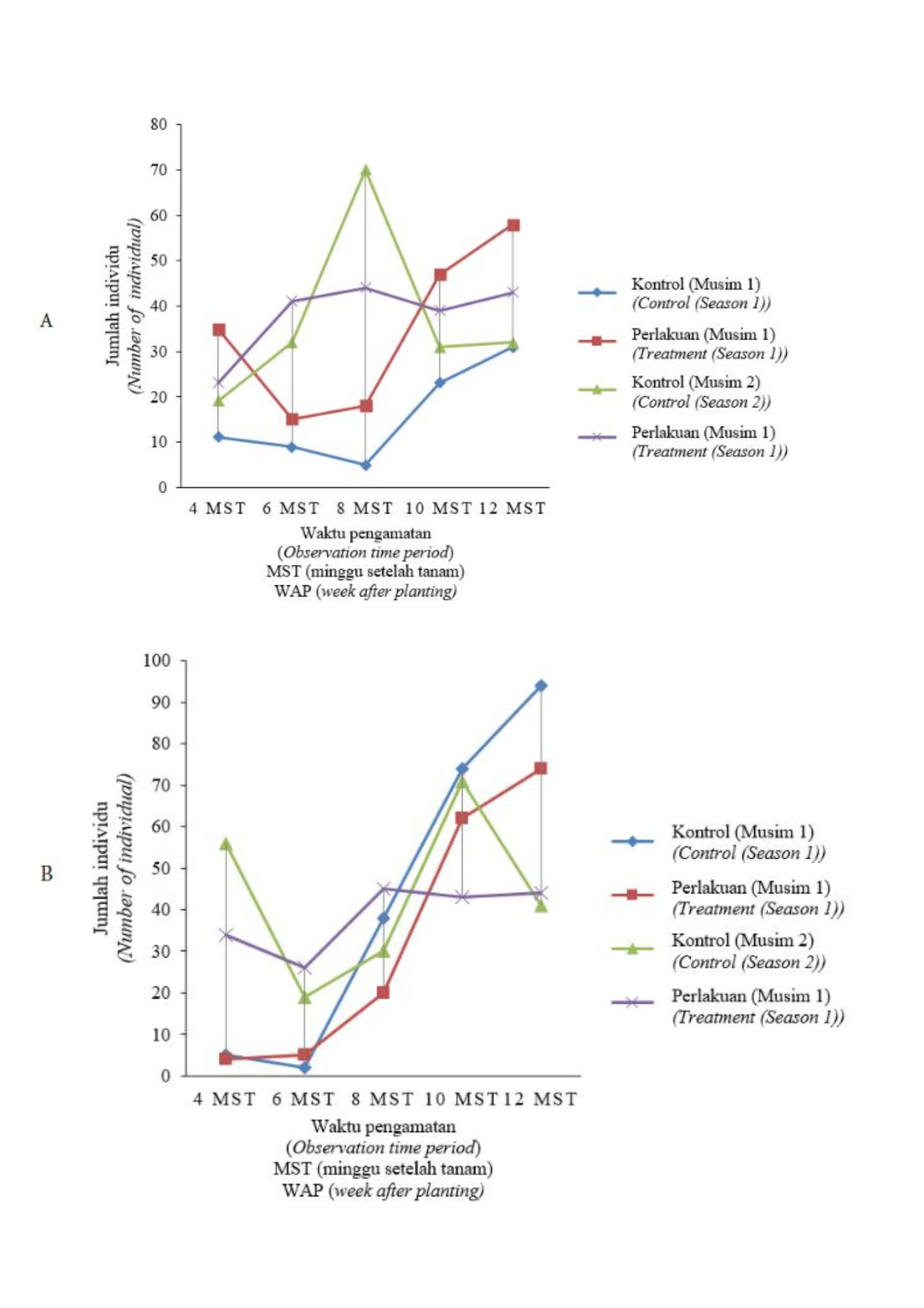 Hasil penelitian diperoleh kelimpahan laba- laba predator sebanyak 626 individu yang termasuk dalam 7 famili dan 40 morfospesies, sedangkan kelimpahan parasitoid Hymenoptera sebanyak 651 individu dari 5 famili dan 63 morfospesiesTabel 1. Kekayaan dan kelimpahan laba-laba predator terbanyak terdapat pada Famili Lycosidae dengan 124 individu dan 11 morfospesies. Untuk parasitoid Hymenoptera, kekayaan spesies dan kelimpahan terbanyak terdapat pada Famili Diapriidae.Berdasarkan umur tanaman jagung, jumlah individu musuh alami menunjukkan fluktuasi baik pada lahan dengan refugia maupun tanpa refugia pada musim 1 dan musim 2Gambar 3. Pada tanaman berumur 6 MST untuk penanaman musim pertama lahan kontrol maupun perlakuan terjadi penurunan jumlah individu laba-laba predator, sedangkan pada musim kedua terjadi sebaliknya. Namun, ketika tanaman memasuki umur 8 MST hingga 12 MST jumlah individu laba-laba musim kedua mengalami fluktuasi. Berbeda halnya dengan yang terjadi pada kelimpahan parasitoid Hymenoptera yang menunjukkan tren menurun saat umur tanaman 6 MST, sedangkan saat tanaman berumur 8 MST hingga 12 MST menunjukkan tren peningkatan jumlah individu pada perlakuan maupun kontrol musim pertama. Sementara itu, jumlah individu parasitoid Hymneoptera pada musim kedua terjadi kondisi yang fluktuatif pada petak kontrol maupun perlakuan.