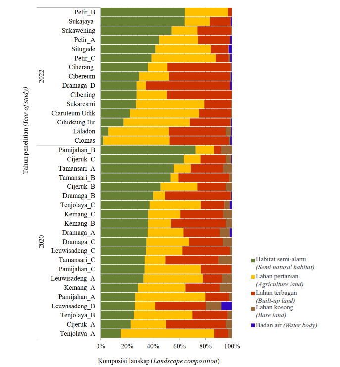 Komposisi lanskap pertanian yang mengelilingi lahan tanaman jagung dalam radius 300 m di 21 lokasi di Bogor pada tahun 2020 didominasi oleh habitat semi-alami (37,63%) dengan luas area (class area/CA semi-alami) berkisar 4,34 ha/(15%, di Tenjolaya A) sampai 20,50 ha (73%, di Pamijahan B) (Table 1; Figure 2). Sementara luas area lahan pertanian (CA pertanian) berkisar 1,67 ha (6%, di Tamansari B) sampai 20,17 ha (71%, di Tenjolaya A). Berbeda dengan 15 lokasi pada tahun 2022 yang didominasi oleh CA pertanian (34,28%) dengan luas berkisar 2,02 ha (7%, di Dramaga D) sampai 14,78 ha (52%, di Sukaresmi). Sementara CA semi-alami berkisar 0,60 ha (2%, di Ciomas) sampai 18,10 ha (64%, di Petir B) (Table 1).