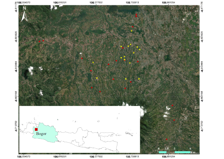 Pengambilan sampel S. frugiperda dilakukan pada bulan Juli–September 2020 dan April–Juni 2022 di lahan tanaman jagung yang berada di Bogor, yakni Kemang, Cijeruk, Tamansari, Leuwisadeng, Pamijahan, Tenjolaya, Situgede, Ciherang, Petir, Dramaga, Cibereum, Sukawening, Sukajaya, Sukaresmi, Ciaruteun Udik, Laladon, Ciomas, Cihideung Ilir, dan Cibening (Figure 1). Lokasi studi memiliki variasi dalam hal elevasi (153–604 m dpl), dengan komposisi lanskap yang bervariasi. Luas lahan jagung yang dipilih manjadi lokasi studi memiliki luas minimum 0,25 ha.