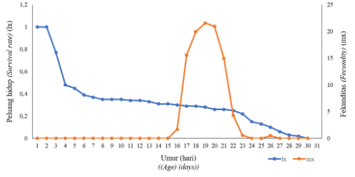 Kurva peluang hidup (lx) M. sexmaculatus pada A. craccivora termasuk kedalam tipe III, hasil yang sama juga didapatkan dari penelitian (Efendi, 2017) pada mangsa A. gossyipii. Pada tipe III, mortalitas atau tingkat kematian diawal perkembangan tinggi, yang disebabkan pada stadia telur M. sexmaculatus persentase keberhasilan menetasnya kecil, yaitu hanya 53% dari 100 butir telur. Pada Gambar 2 (Figure 2) (kurva peluang hidup) memperlihatkan telur berhasil menetas di hari ke-3 sebanyak 42 butir dan di hari ke-4 sebanyak 11 butir. Telur yang tidak menetas dapat dipastikan dengan masa inkubasi yang lebih dari satu minggu, telur ini berwarna kuning dan cokelat kehitaman. Telur yang berwarna kuning setelah dilakukan pembedahan, hanya berisi cairan berwarna kuning. Telur yang berisi cairan tersebut disebabkan oleh kurangnya sperma jantan untuk membuahi telur. Menurut(Sudarjat et al., 2020), telur M. sexmaculatus yang tidak menetas diduga karena kegagalan atau sedikitnya jumlah sperma jantan membuahi telur, walaupun sebelumnya telah berkopulasi. Sementara telur yang berwarna cokelat kehitaman setelah dilakukan pembedahan, telur berisi calon larva, dengan perkembangan morfologi tubuhnya yang lengkap, seperti kepala dengan alat mulut, toraks dengan tiga pasang tungkai, dan abdomen. Pada kurva fekunditas (mx) di umur 1−11 hari predator masih mengalami perkembangan dari stadia telur hingga imago terbentuk. Keperidian imago betina dapat dilihat dengan cara menghitung jumlah telur yang dihasilkan setiap harinya. Ketika di hari ke-13 imago jantan dan betina melakukan kopulasi, kemudian kurva menunjukkan peletakan telur pertama, yaitu di umur 16 hari, lalu rataan jumlah telur tertinggi di umur 19 hari, dan peletakan telur berakhir di umur 26 hari.