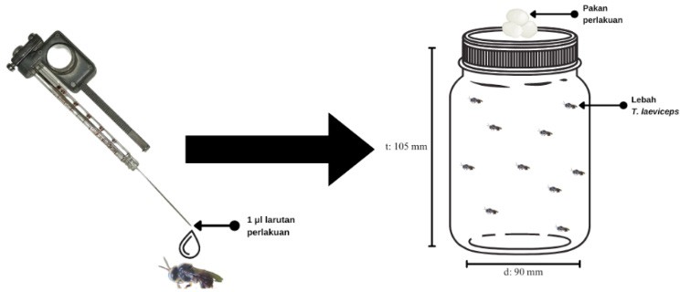 Setiap perlakuan menggunakan 10 individu lebah dan diulang 3 kali. Lebah yang telah diberi perlakuan kemudian dipelihara di dalam wadah pemeliharaan dan diberi pakan menggunakan bola kapas yang mengandung madu 10%. Pengamatan dilakukan pada 48 jam setelah perlakuan (JSP).