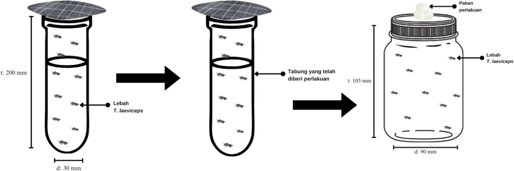Lebah T. laeviceps (Hymenoptera: Apidae: Meliponini) berasal dari koloni pemeliharaan Laboratorium Fisiologi dan Toksikologi Serangga, Departemen Proteksi Tanaman, Fakultas Pertanian, IPB University. Koloni lebah dipelihara dalam kotak standar (panjang 30 cm, lebar 10 cm, tinggi 9 cm) yang diletakkan di bawah naungan/atap. Serangga uji yang digunakan merupakan lebah pekerja. Lebah pekerja diaklimatisasi selama satu jam di dalam tabung kaca (diameter 30 mm dan tinggi 200 mm) sebelum digunakan untuk pengujian.