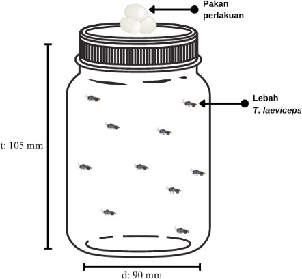 Lebah T. laeviceps yang digunakan telah diaklimatisasi tanpa pakan selama satu jam di dalam wadah pemeliharaan (diameter 90 mm dan tinggi 105 mm). Sediaan insektisida uji dengan masing-masing taraf perlakuan diambil menggunakan bola kapas. Bola kapas yang mengandung larutan uji diletakkan pada bagian atas wadah pemeliharaan (Gambar 3) dan dipaparkan selama 5 menit. Selanjutnya bola kapas yang mengandung larutan uji diganti dengan bola kapas lain yang mengandung 10% madu untuk pakan selama pemeliharaan. Setiap perlakuan menggunakan 10 individu lebah dan diulang 3 kali. Lebah kemudian dipelihara dan diamati selama 48 JSP.