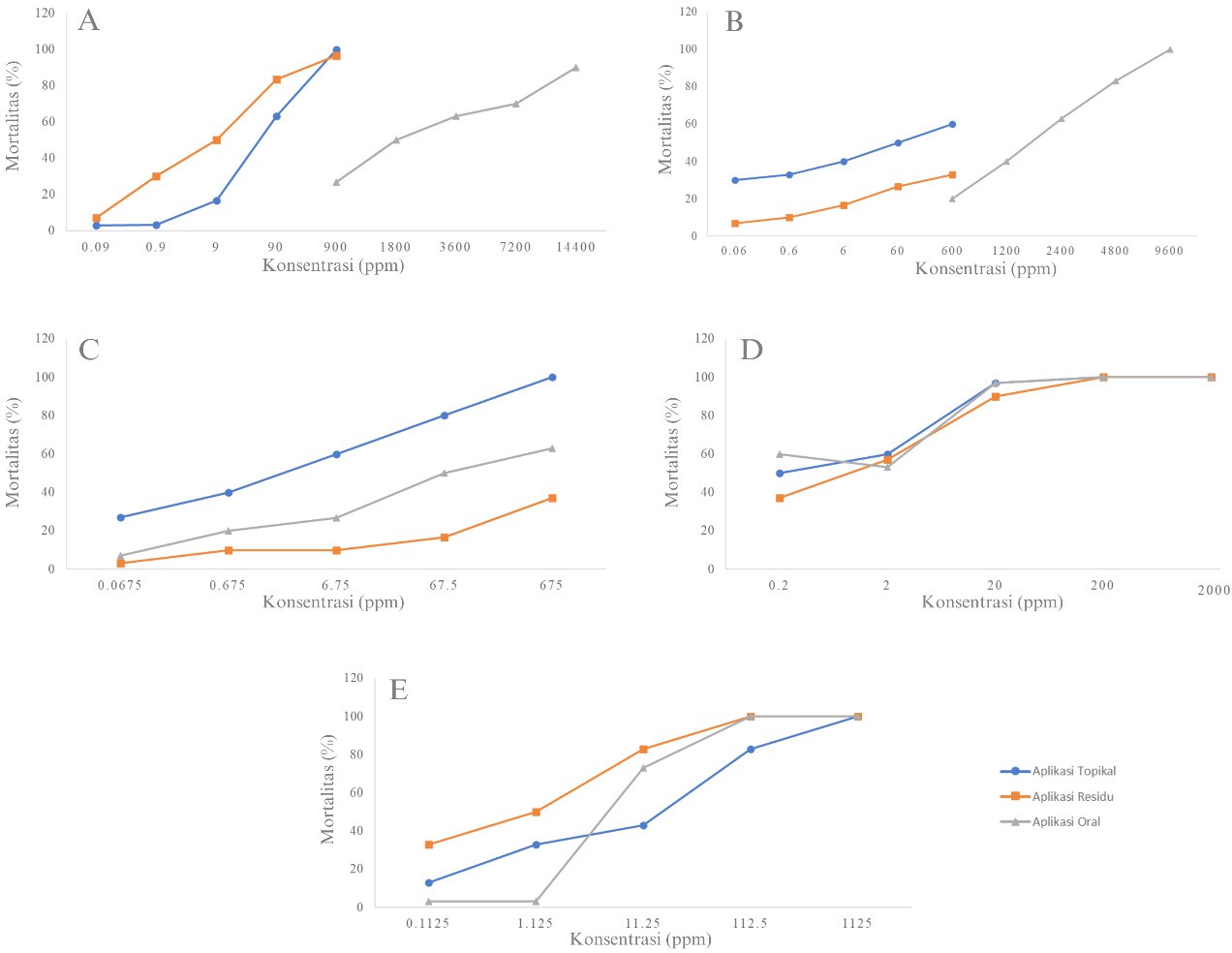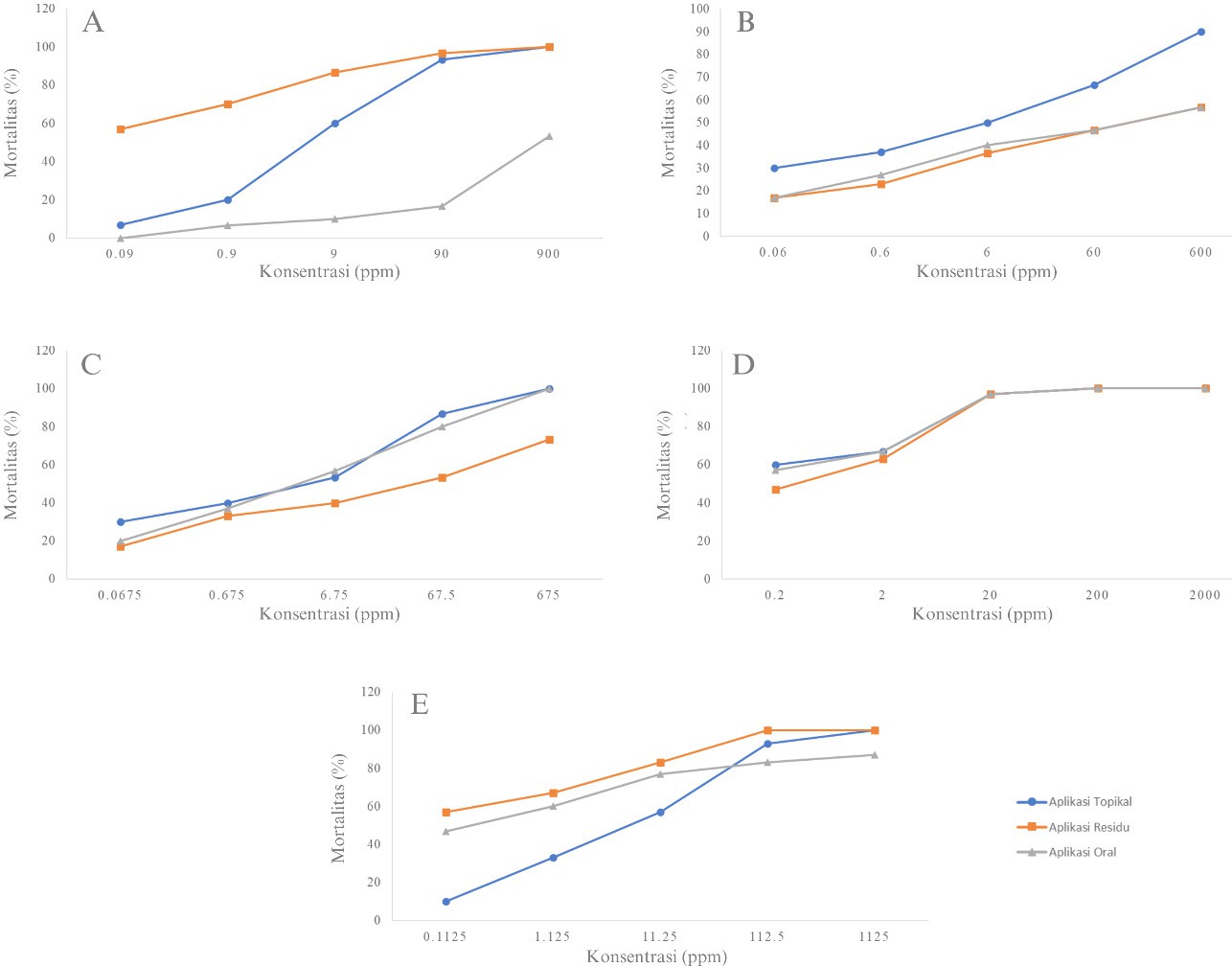 Perlakuan kelima insektisida terhadap T. laeviceps menunjukkan hubungan yang linier antara konsentrasi bahan aktif yang digunakan dan mortalitas lebah (Gambar 4). Semakin tinggi konsentrasi bahan aktif yang diaplikasikan maka semakin banyak jumlah lebah yang mati. Perlakuan insektisida indosakarb secara tunggal pada konsentrasi 900 ppm dengan aplikasi topikal menyebabkan tingkat mortalitas sebesar 100% yang menunjukkan lebih tinggi dari pada aplikasi residu (97%) dan aplikasi oral (27%) (Gambar 4A). Sementara itu, mortalitas lebah hanya mencapai 63% (aplikasi topikal) dan 83% (aplikasi residu) pada konsentrasi anjuran 90 ppm. Paparan insektisida berbahan aktif klorfenapir dengan aplikasi topikal pada konsentrasi anjuran 600 ppm menunjukkan tingkat mortalitas lebah lebih tinggi, yaitu sebesar 60% dibandingkan dengan aplikasi residu sebesar 33% dan aplikasi oral sebesar 20% (Gambar 4B). Paparan insektisida berbahan aktif indosakarb dan klorfenapir secara tunggal pada aplikasi topikal pada konsentrasi anjuran 675 ppm menyebabkan tingkat mortalitas lebah 100%, sedangkan pada aplikasi residu dan oral hanya menghasilkan tingat mortalitas berturut-turut 37% dan 63% (Gambar 4C).
