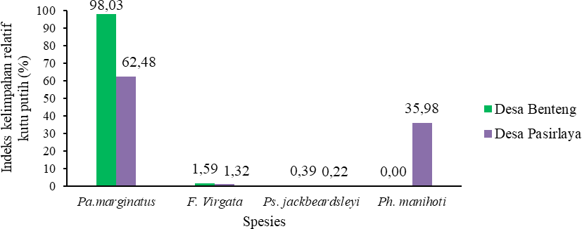 Berdasarkan hasil penelitian, ditemukan empat spesies kutu putih pada tanaman singkong, yaitu Paracoccus marginatus, Ferrisia virgata (Cockerell), Pseudococcus jackbeardsleyi (Gimpel & Miller), dan Phenacoccus manihoti Matile-Ferrero (Gambar 2). Spesies Pa. marginatus memiliki kelimpahan relatif tertinggi di kedua lokasi, dengan persentase sebesar 98,03% di Desa Benteng dan 62,48% di Desa Pasirlaya, hal ini menunjukkan bahwa spesies ini mendominasi pada kanopi tanaman singkong. kemudian, diikuti oleh F. virgata dengan persentase 1,59% di Desa Benteng dan 1,32% di Desa Pasirlaya. Selanjutnya Ps. jackbeardsleyi dengan persentase 0,39% di Desa Benteng dan 0,22% di Desa Pasirlaya. Phenacoccus manihoti tidak ditemukan di Desa Benteng, namun ditemukan di Desa Pasirlaya dengan persentase 35,98% (Gambar 3). Spesies Ph. manihoti menempati posisi kedua terbanyak setelah Pa. marginatus di Desa Pasirlaya.