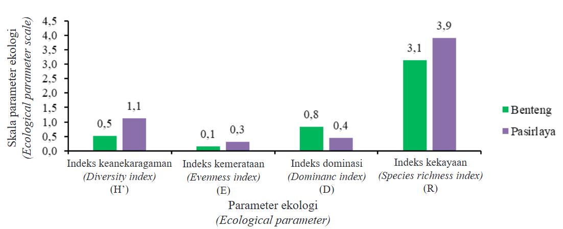 Hasil analisis struktur komunitas arthropoda pada kanopi tanaman singkong menunjukkan bahwa nilai indeks keanekaragaman di Desa Benteng sebesar 0,5 dan di Pasirlaya sebesar 1,1 (Gambar 4). Indeks keanekaragaman di Desa Benteng berkategori rendah (H’ ≤ 1), sedangkan di Pasirlaya berkategori sedang (1 < H’ < 3). Indeks kemerataan di Desa Benteng sebesar 0,1 dan di Pasirlaya sebesar 0,3 (Gambar 4). Indeks kemerataan di Desa Benteng dan Pasirlaya berkategori kecil (0 < E ≤ 0,4), namun indeks kemerataan di Pasirlaya lebih tinggi dibandingkan dengan Benteng. Indeks dominansi di Desa Benteng sebesar 0,8 dan di Pasirlaya sebesar 0,4 (Gambar 4). Indeks dominansi di Desa Benteng berkategori tinggi (0,75 < D < 1), sedangkan di Pasirlaya berkategori rendah (0 < D ≤ 0,5). Indeks kekayaan di Desa Benteng sebesar 3,1 dan di Pasirlaya sebesar 3,9 (Gambar 4). Indeks kekayaan di Desa Benteng berkatogeri rendah (R< 3,5), sedangkan di Pasirlaya berkategori sedang (R = 3,5–5,0). Indeks kesamaan antara lokasi Benteng dan Pasirlaya sebesar 78%. Indeks kesamaan antara dua lokasi ini berkategori tinggi (S = 61–91%).