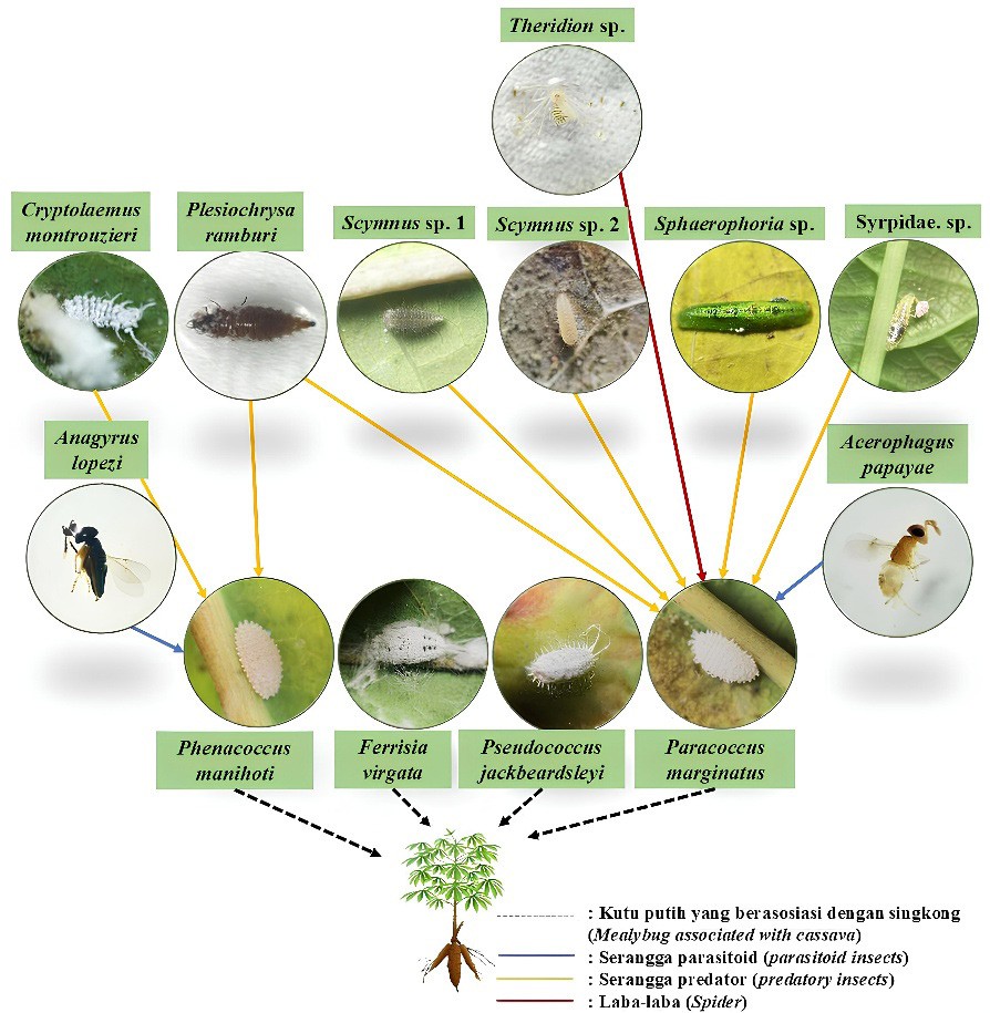 Berdasarkan hasil penelitian, ditemukan dua bentuk interaksi dalam suatu struktur komunitas musuh alami yang berkaitan dengan kutu putih, yaitu interaksi antara kutu putih dan predator, serta interaksi antara kutu putih dan parasitoid (Gambar 5). Hasil pengamatan menunjukkan terdapat dua spesies parasitoid yang keluar dari tubuh kutu putih yang terparasit, yaitu A. papayae pada Pa. marginatus dan A. lopezi pada Ph. manihoti, kemudian terdapat tujuh spesies predator yang memangsa kutu putih Pa. marginatus dan Ph. manihoti, yaitu C. montrouzieri, Plesiochrysa ramburi (Schneider), Scymnus sp. 1, Scymnus sp. 2, Sphaeroporia sp., Syrphidae sp, dan Theridion sp.