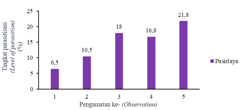 Dalam suatu komunitas, terdapat interaksi antara parasitoid dan inangnya yang disebut parasitasi, dan dapat diukur melalui tingkat parasitisasi. Tingkat parasitisasi menggambarkan efektivitas parasitoid dalam menekan populasi hama. Pada penelitian ini, tingkat parasitisasi dianalisis berdasarkan hubungan antara A. papayae terhadap Pa. marginatus di Desa Benteng dan Pasirlaya (Gambar 6), serta A. lopezi terhadap Ph. manihoti di Desa Pasirlaya karena A. lopezi tidak ditemukan di Benteng (Gambar 7). Parasitoid A. papayae terhadap Pa. marginatus di Desa Benteng dan Pasirlaya menunjukkan bahwa nilai tingkat patasitisasi di lokasi benteng cenderung fluktuatif dengan nilai tertinggi pada pengamatan ke-1 (25,7%) dan terendah pada pengamatan ke-3 (10,1%), sedangkan tingkat parasitisasi di Pasirlaya terlihat meningkat dan konsistensi yang lebih baik, dengan parasitisasi tertinggi pada pengamatan ke-4 (25,99%) dan tidak pernah turun di bawah 7,6%. Parasitoid A. lopezi terhadap Ph. manihoti di Desa Pasirlaya menunjukkan peningkatan secara umum dari pengamatan ke-1 hingga ke-5. Parasitisasi awalnya rendah (6,5%) dan mengalami peningkatan yang cukup konsisten, dengan puncaknya di pengamatan ke-5 (21,8%).