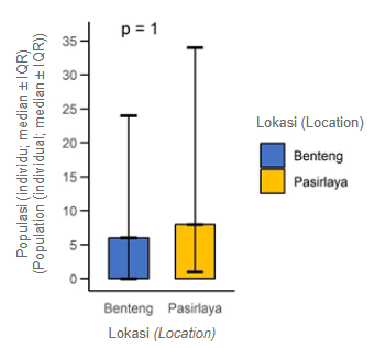 Analisis data dilakukan menggunakan Microsoft Excel 2021 untuk menghitung indeks ekologi, meliputi kelimpahan relatif (KR), keanekaragaman (H’), kemerataan (E), dominansi (D), kekayaan jenis (R), kesamaan jenis antar lokasi (S), serta tingkat parasitisasi parasitoid terhadap kutu putih. Uji asumsi klasik dilakukan dengan menguji normalitas dan homogenitas varians data. Data populasi arthropoda memiliki varians yang homogen, tetapi tidak berdistribusi normal sehingga dianalisis lebih lanjut menggunakan uji non-parametrik Mann-Whitney (α = 0,05) untuk membandingkan perbedaan antara dua lokasi, yaitu Benteng dan Pasirlaya. Uji dilakukan menggunakan R Studio versi 4.4.3. Keputusan diambil berdasarkan nilai p-value: p < 0,05 menunjukkan perbedaan signifikan, p > 0,05 menunjukkan tidak ada perbedaan signifikan, p = 1 menunjukkan distribusi yang sama persis antara lokasi.