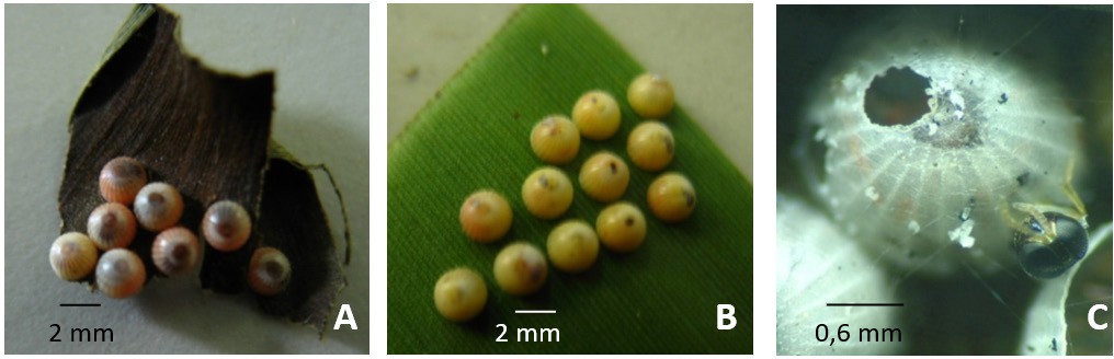 Gambar 2.Gejala parasitisasi Ooencyrtus erionotae pada telur inang Erionota thrax. A: telur tidak terparasit; B: telur terparasit; C: lubang bekas keluar imago parasitoid O. erionotae.