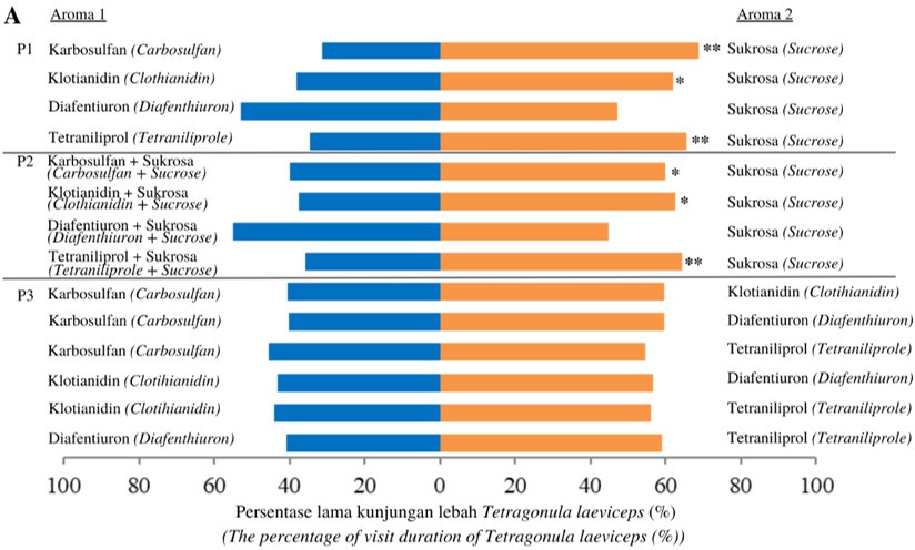 Pengujian olfaktori lebah secara umum menunjukkan bahwa lebah T. laeviceps memiliki preferensi yang lebih tinggi terhadap sukrosa dibandingkan dengan insektisida maupun campuran insektisida dengan sukrosa. Durasi kunjungan lebah terhadap sukrosa umumnya lebih lama dibandingkan dengan kunjungan lebah terhadap insektisida (Gambar 1A). Meskipun demikian, paparan insektisida dalam uji olfaktori tidak memengaruhi frekuensi kunjungan lebah, baik antara insektisida yang berbeda maupun antara insektisida dan sukrosa. Lebah T. laeviceps tetap mengunjungi perlakuan insektisida dengan frekuensi yang tidak berbeda signifikan dibandingkan dengan frekuensi kunjungan lebah terhadap sukrosa (Gambar 1B). Hasil ini menunjukkan bahwa meskipun lebah terpapar insektisida, lebah tetap mengunjungi tanaman atau bunga yang terkontaminasi insektisida sebagai sumber makanannya sehingga meningkatkan risiko paparan insektisida, baik melalui dermal maupun oral. Selain itu, analisis preferensi lebah terhadap keempat insektisida yang diuji (P3) tidak menunjukkan adanya kecenderungan lebah lebih menyukai salah satu insektisida. Durasi dan frekuensi kunjungan lebah terhadap insektisida karbosulfan, klotianidin, diafentiuron, dan tetraniliprol tidak menunjukkan perbedaan yang signifikan.