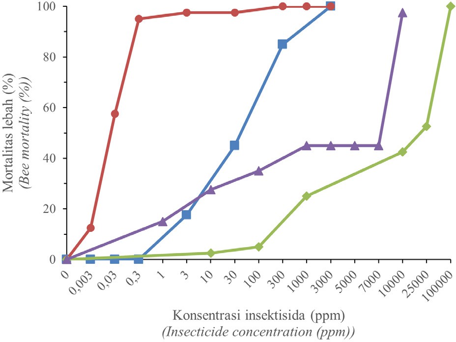 Pengujian tingkat toksisitas insektisida terhadap sintasan lebah dilakukan secara dermal melalui residu dan oral melalui pakan. Sementara itu, pengujian untuk melihat pengaruh insektisida terhadap kemampuan makan lebah dilakukan secara oral melalui pakan saja.