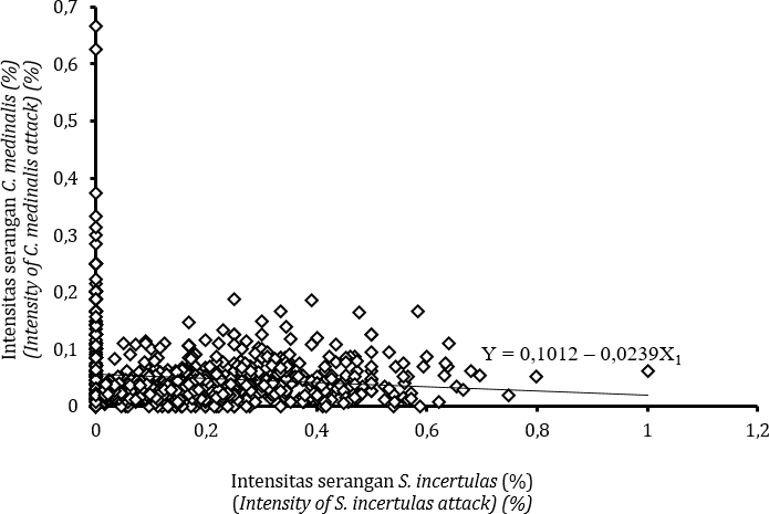 Secara umum, kedua variabel memberikan pengaruh yang sangat kuat terhadap variabel intensitas serangan C. medinalis. Berdasarkan hasil persamaan tersebut, terdapat koefisien regresi variabel X1 (intensitas serangan S. incertulas) yang diperoleh sebesar 0,2390 dengan tanda negatif. Hal ini dapat menjelaskan gambaran hubungan antara serangan S. incertulas terhadap C. medinalis. Hubungan yang terjadi antara variabel X1 dan variabel Y berupa hubungan berkebalikan sehingga semakin besar pengaruh serangan S. incertulas maka semakin rendah serangan