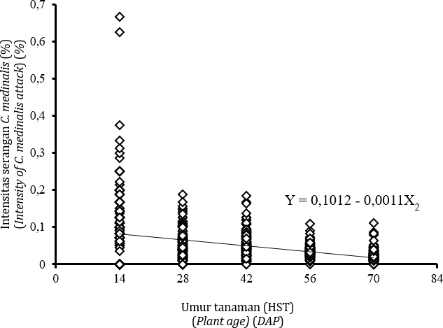Y = 0,1012 - 0,0239X1 - 0,001124X2, dengan Y: intensitas serangan C. medinalis; X1: intensitas serangan S. incertulas; X2: usia tanaman.