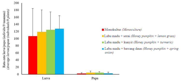 Analisis ragam menunjukkan bahwa penerapan pola tanam tumpang sari tidak berpengaruh nyata terhadap populasi larva/pupa A. saltator. Rata-rata populasi larva pada perlakuan monokultur labu madu, yaitu 107 larva/9 tanaman, tumpang sari labu madu dan serai 119 larva/9 tanaman, labu madu dan kunyit 125 larva/9 tanaman serta labu madu dan bawang daun 128 larva/9 tanaman. Adapun rata-rata populasi pupa pada perlakuan monokultur labu madu, yaitu 2 pupa/9 tanaman, tumpang sari labu madu dan serai 5 larva/9 tanaman, labu madu dan kunyit 5 pupa/9 tanaman serta labu madu dan bawang daun 3 pupa/9 tanamanGambar 1.