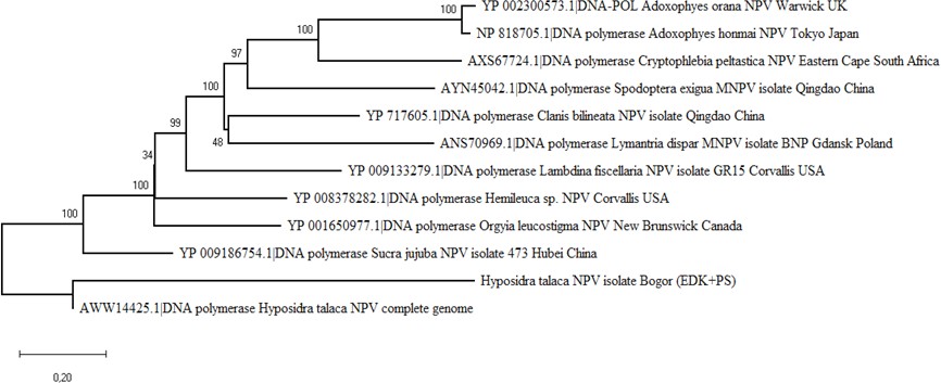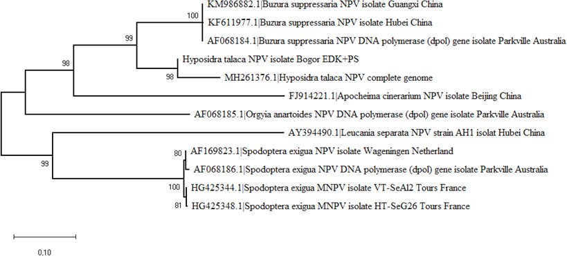 Menurut (Gerdol et al., 2018) bahwa spesies yang sama, tetapi letak geografisnya berbeda dapat memiliki keragaman genetik. Tingkat keragaman genetik dalam suatu spesies dipengaruhi oleh jumlah individu, distribusi geografis, dan sistem genetik. Hasil BLAST sekuens DNA polimerase dengan nukleotida menunjukkan bahwa isolat HytaNPV Bogor memiliki kemiripan paling tinggi dengan isolat HytaNPV India dengan query cover 99%, identitas 96,68%, dan skor maks/total 5809 pb (No Akses: MH261376 .1). Berdasarkan hasil BLAST juga diketahui bahwa isolat HytaNPV asal Bogor memiliki kesamaan genetik dengan isolat Buzura suppressaria NPV asal Guangxi, China, dengan skor max/total 3377 pb, query cover 99%, identitas 81,61% (Nomor akses: KM986882.1) dan Buzura suppressaria NPV mengisolasi Hubei, China dengan skor maks/total 3376 pb, sampul kueri 99%, identitas 81,52% (No Akses: KF611977.1), dan Buzura suppressaria NPV mengisolasi Parkville, Australia dengan skor maks/total 2107 pb, query cover 54%, identitas 84,69% (Nomor akses: AF068184.1). Isolat HytaNPV Bogor juga dilakukan perbandingan BLAST dengan isolat NPV yang menyerang Ordo Lepidoptera lainnya. Isolat HytaNPV Bogor dibandingkan dengan NPV yang menyerang spesies lain, seperti Apocheima cinerarium (Erschoff), Orgyia anartoides (Walker), dan Spodoptera exigua (Hubner), menunjukkan nilaikesamaan genetik yang lebih rendah dengan query cover 36–76% dan identitas 67–70%.