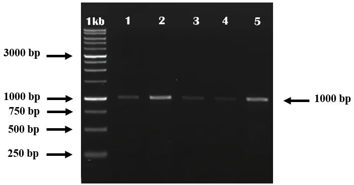Gambar 2.Visualisasi DNA HytaNPV pada agarose menggunakan UV-transiluminator. Marker 1 kb(Visualization of HytaNPV DNA on agar media using UV-transilluminator. Marker 1 kb (Thermoscientific, US), 1–5 (HytaNPV isolate Bogor, West Java))