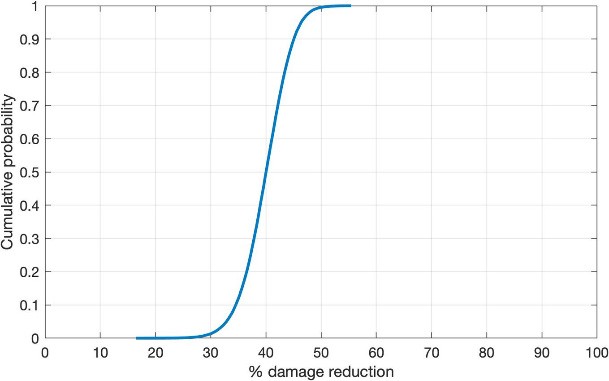 Figure 3.Cumulative distribution function (CDF) of % damage reduction due to yellow stemborer in PFP plot compared to CGP. The wet season, 2020–2021. The median damage reduction at the 0.5 mark on the y-axis gives value ~40% damage reduction.