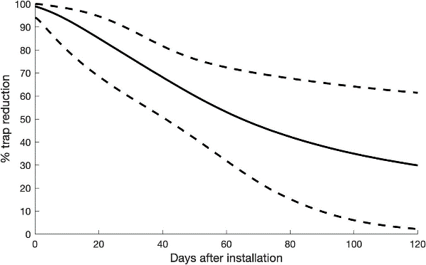 Figure 1.Percentage trap reduction in PFP compared to CGP over a wet season, 2020–2021. The solid line represents median trap reduction, and the dotted lines represent 95% credible intervals.