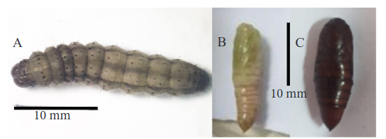 Gambar 2.Perkembangan pupa Spodoptera frugiperda. A: fase prapupa; B: fase awal; C: fase pupa.(Development of Spodoptera frugiperda pupae. A: prepupal phase; B: early phase; C: pupa phase.)