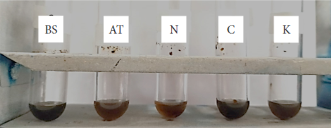 Gambar 1.Hasil uji terpenoid ekstrak pupa black soldier fly yang diberi ragam perlakuan pakan. BS: buah dan sayur; AT: ampas tahu; N: nasi; C: campuran; K: pakan T51 (kontrol).(Terpenoid assay results of black soldier fly pupae extracts treated with different feed treatments. BS: fruits and vegetable; AT: tofu pulp; N: rice; C: mixture; K: T51 feed (control)).