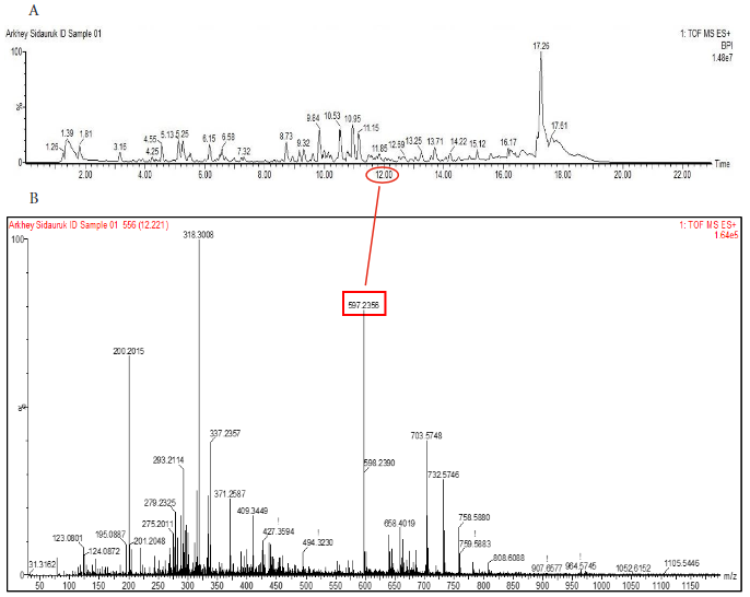 Gambar 2.Kromatogram LC-MS pada ektrak sampel 1 (ekstrak sampel perlakuan pakan buah dan sayur), yang ditandai dengan lingkaran merah adalah puncak yang menunjukkan adanya astaxanthin. A: kromatogram LC-MS ekstrak sampel 1 yang teridentifikasi adanya astaxanthin; B: mass spectra astaxanthin pada retensi 12 menit 22 detik, massa molekuler 597 m/z.(LC-MS chromatogram of sample extract 1 (fruit and vegetable feed treatment sample extract), marked with red circle is the peak indicating the presence of astaxanthin. A: LC-MS chromatogram of sample 1 extract which identified the presence of astaxanthin; B: mass spectra of astaxanthin at retention of 12 minutes 22 seconds, molecular mass 597 m/z.)