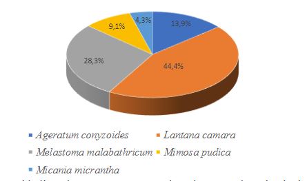 Gambar 2.Proporsi kelimpahan serangga pengunjung bunga pada setiap jenis tumbuhan liar.(The proportion of abundance of flower-insect visitors on each kind of wild plant.)