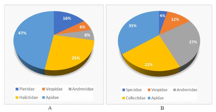 Pengunjung bunga tumbuhan liar di sekitar jambu mete terdiri atas dua ordo dan lima famili. Anggota Famili Apidae (47%) tercatat paling tinggi, diikuti Halictidae, Pieridae, dan terendah Famili Andrenidae dan Vespidae masing-masing (6%). Sementara itu, pengunjung bunga jambu mete tertinggi Famili Apidae (35%), diikuti Andrenidae, Colletidae, Vespidae, dan terendah (4%) adalah Sphecidae (Gambar 1A dan IB). Jenis serangga pengunjung bunga tumbuhan liar terdiri atas enam genus, yakni Eurema sp., Seledonia (Halictus) sp., Xylocopa sp., Apis sp., Calliopsis sp.,dan Vespa sp.,sedangkan pengunjung bunga jambu mete terdiri atas delapan genus, yakni Apis sp., Xylocopa sp., Tetragonula sp., Polistes sp., Vespa sp., Calliopsis sp., Hylaeus sp.,dan Ammophila sp. Empat pengunjung bunga jambu mete genus Tetragonula sp., Polistes sp., Ammophila sp., Hylaeus sp. tidak ditemukan pada bunga tumbuhan liar. Jenis serangga tersebut adalah penyerbuk jambu mete(Vanitha & Raviprasad, 2019)(Taek, 2023) kecuali Polistes sp.,