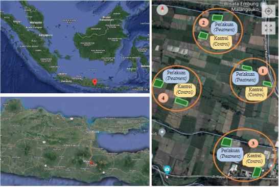 Gambar 1.Lokasi empat area penelitian di Desa Tumpang, Kecamatan Tumpang, Kabupaten Malang, Jawa Timur. Catatan: Setiap area terdiri atas petak perlakuan dan kontrol.(The location of the four research areas is in Tumpang Village, Tumpang District, Malang Regency, East Java. Note: Each area consists of treatment and control plots.)