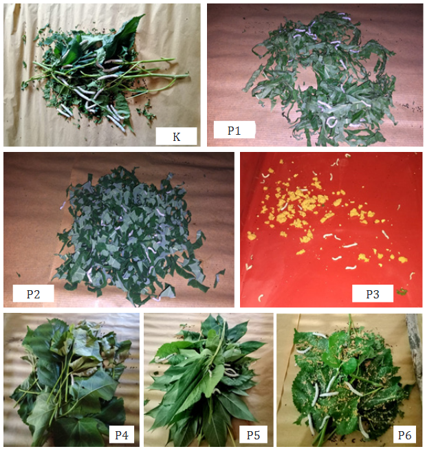 Figure 1.Alternative food variations for silkworms. K: silkworms fed only mulberry leaves (control); P1: silkworms fed only castor leaves; P2: silkworms fed only cassava leaves; P3: silkworms fed only broiler chicken feed; P4: silkworms fed with combination of castor and mulberry leaves; P5: silkworms fed with combination of cassava and mulberry leaves; and P6: silkworms fed with combination of broiler chicken feed and mulberry leaves.